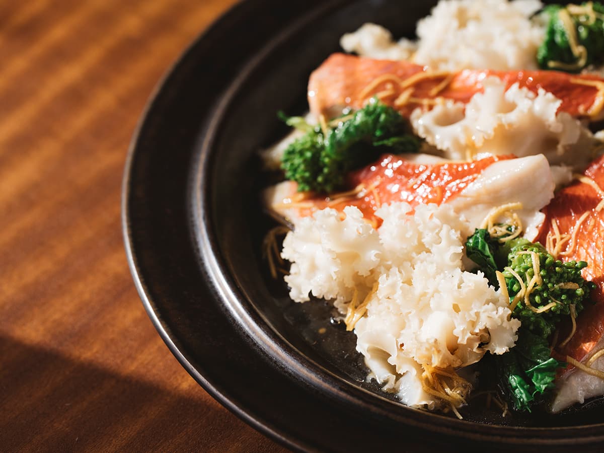 ホホホタケのうま味・食感・香り、全てを最大限活かした料理。金目鯛に負けないおいしさとその華やかさで食卓を盛り上げてくれます。