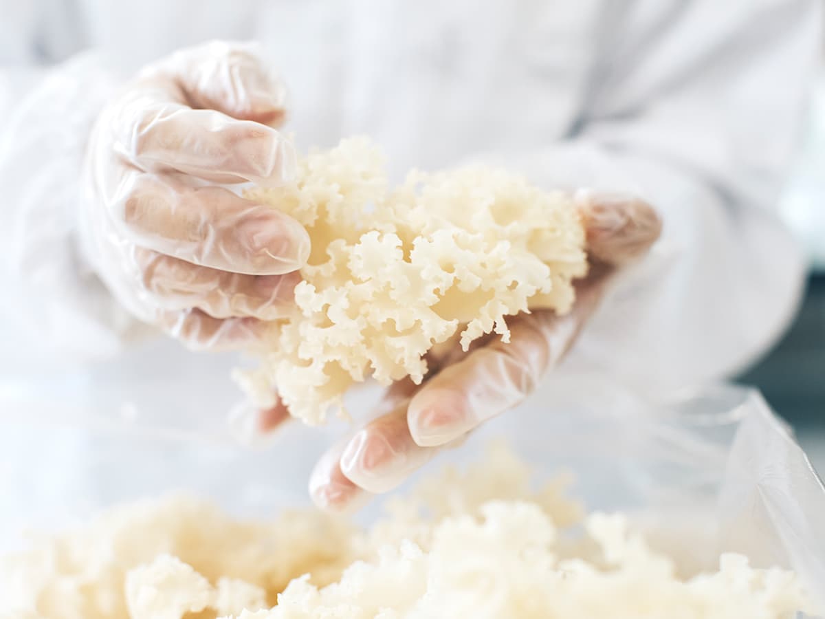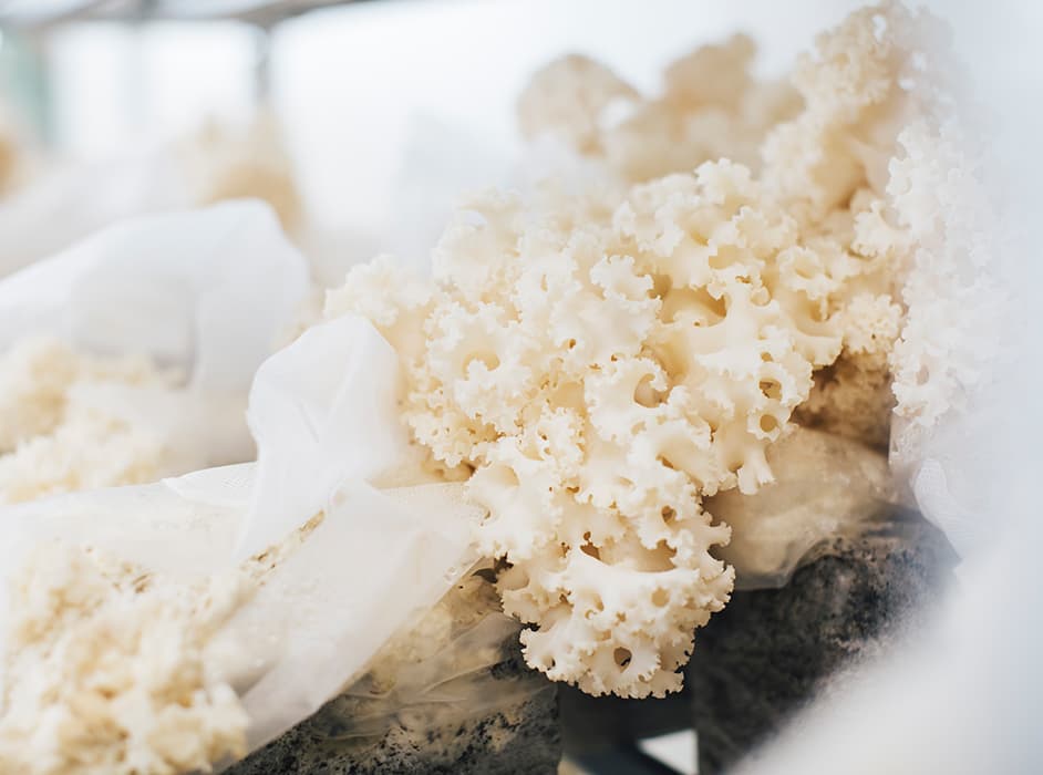 ホホホタケは「はなびらたけ」という品種のキノコです。標高1000mを超える高山のごく限られた環境でしか育たないため採取量が極めて少なく、別名“幻のキノコ”と呼ばれることも。私たち大井川電機製作所は電球事業で培った生産管理技術を活かし、温度・湿度・二酸化炭素などを緻密に制御することで高品質な栽培を実現しています。